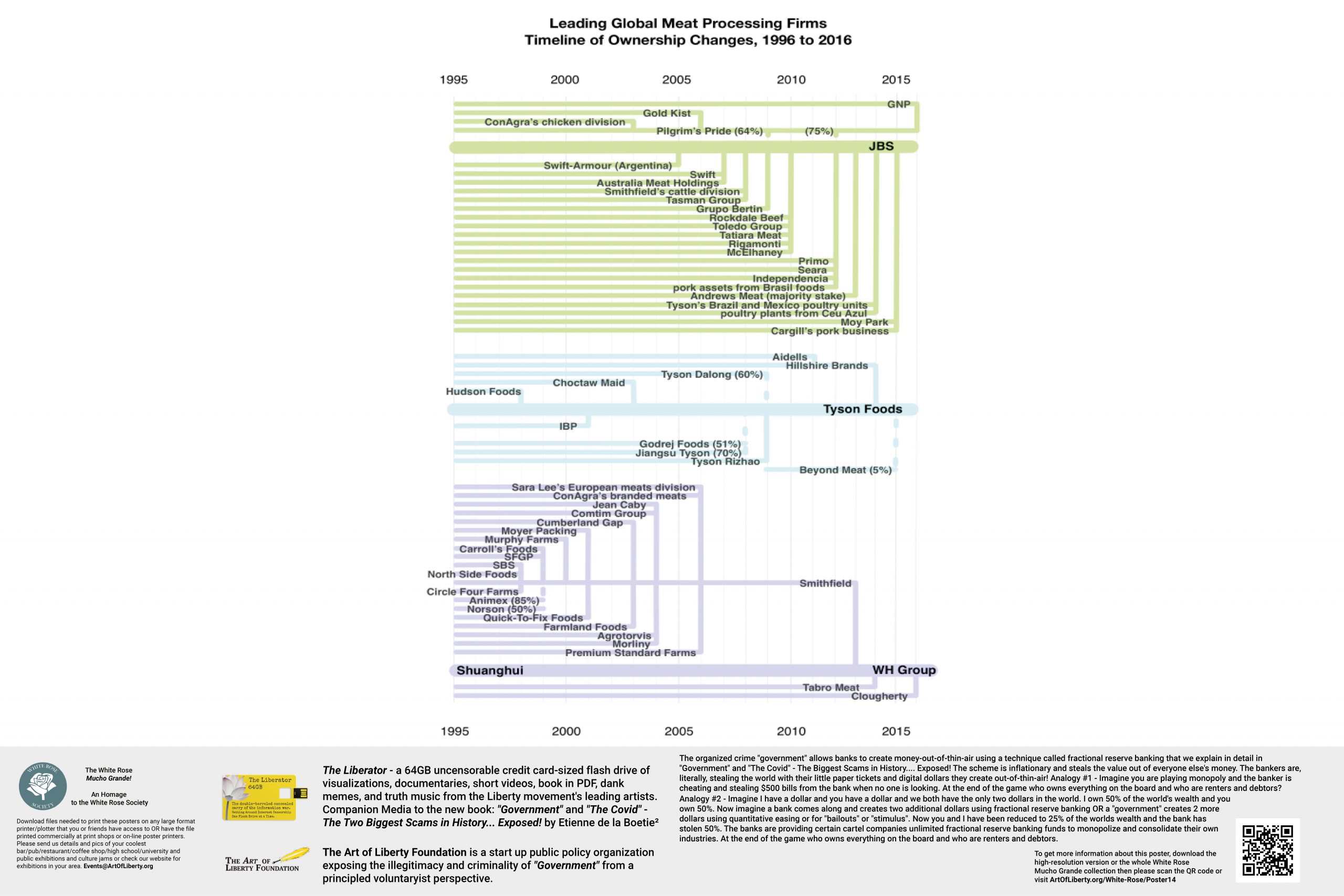 The White Rose – MUCHO GRANDE!  Instead of stickers, we have a free file of POSTERS featuring the full-size, high-res visualizations from “Government” – The Biggest Scam in History… Exposed!, a book revealing how inter-generational organized crime runs the “government,” media and academia, and a series of visualizations showing the monopolization of: media, consumer goods, defense contractors, beer, beverages, meat processing, airlines, community newspapers, and banks among others. The posters are designed to be exhibited in coffee shops, university commons, and other high-traffic locations, including liberty festivals, conferences and events in a decentralized manner by any activist that understands the power of visualization.
