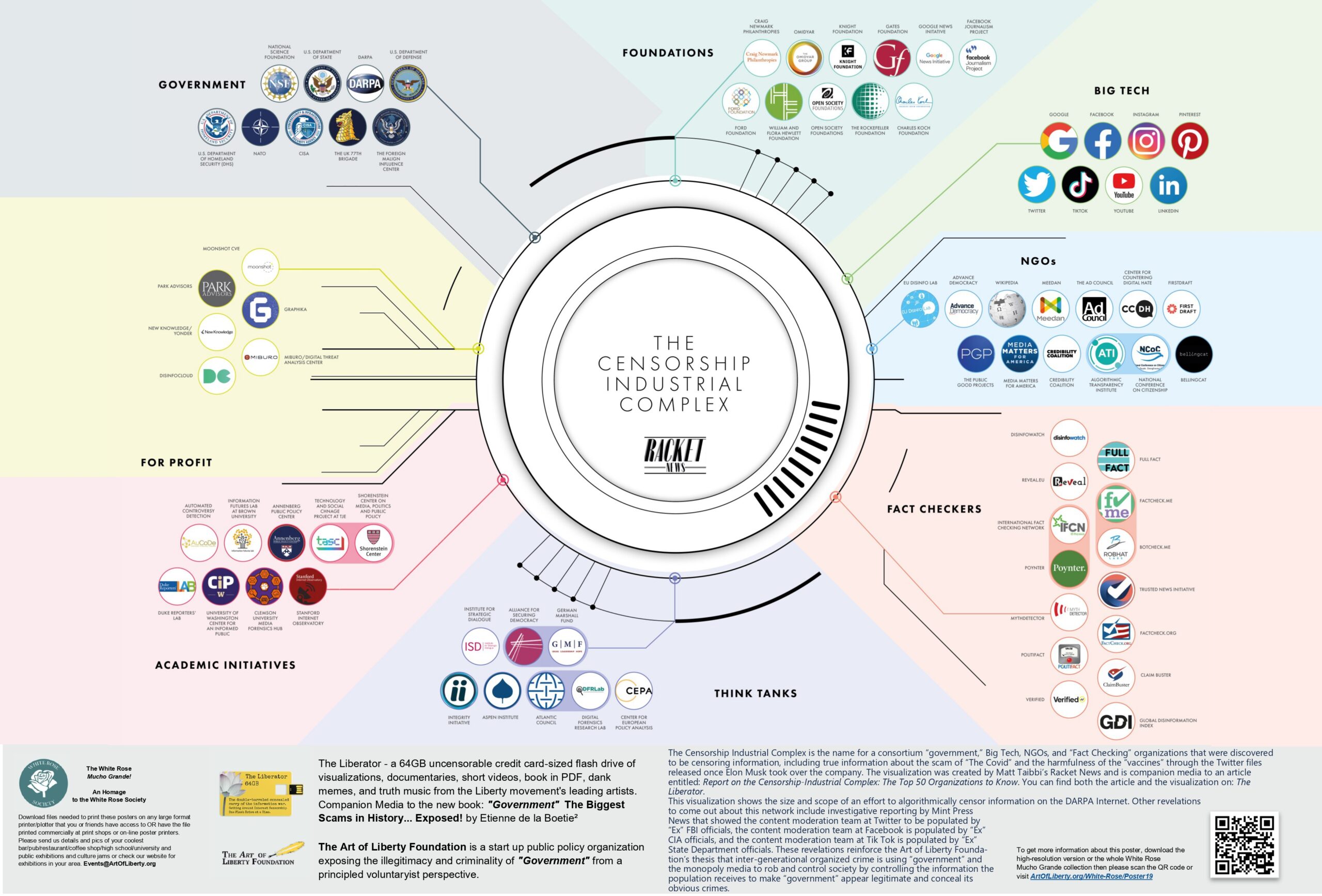 The Censorship Industrial Complex is the name for a consortium “government,” Big Tech, NGOs, and “Fact Checking” organizations that were discovered to be censoring information, including true information about the scam of “The Covid” and the harmfulness of the “vaccines” through the Twitter files released once Elon Musk took over the company. The visualization was created by Matt Taibbi’s Racket News and is companion media to an article entitled: Report on the Censorship-Industrial Complex: The Top 50 Organizations to Know. You can find both the article and the visualization on: The Liberator.