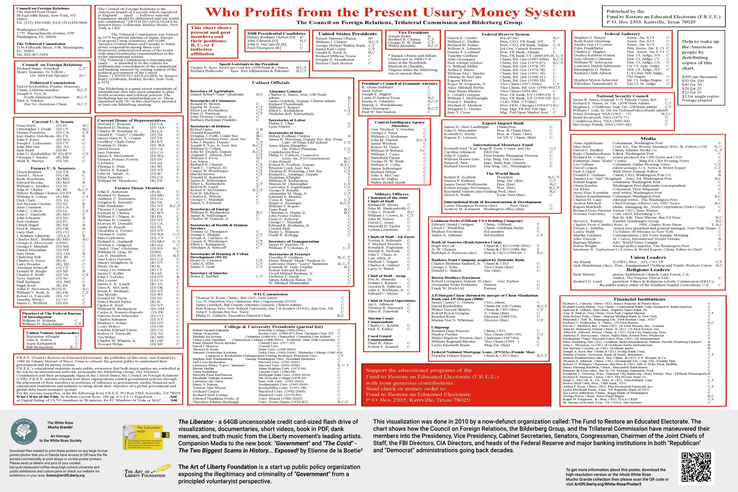 This visualization was done in 2010 by a now-defunct organization called: The Fund to Restore an Educated Electorate. The chart shows how the Council on Foreign Relations, the Bilderberg Group, and the Trilateral Commission have maneuvered their members into the Presidency, Vice Presidency, Cabinet Secretaries, Senators, Congressman, Chairmen of the Joint Chiefs of Staff, the FBI Directors, CIA Directors, and heads of the Federal Reserve and major banking institutions in both “Republican” and “Democrat” administrations going back decades.