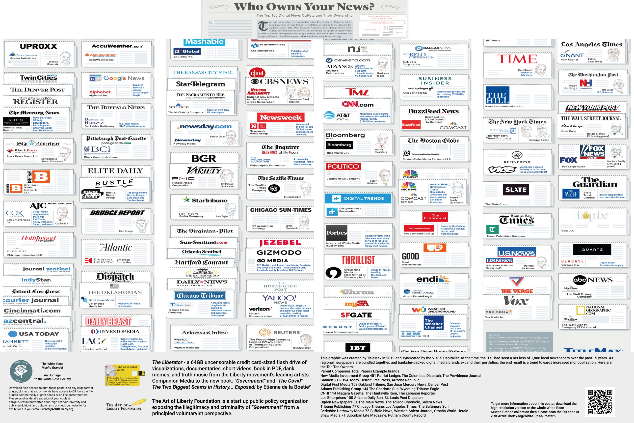 The White Rose – MUCHO GRANDE! Instead of stickers, we have a free file of POSTERS featuring the full-size, high-res visualizations from “Government” – The Biggest Scam in History… Exposed!, a book revealing how inter-generational organized crime runs the “government,” media and academia, and a series of visualizations showing the monopolization of: media, consumer goods, defense contractors, beer, beverages, meat processing, airlines, community newspapers, and banks among others. The posters are designed to be exhibited in coffee shops, university commons, and other high-traffic locations, including liberty festivals, conferences and events in a decentralized manner by any activist that understands the power of visualization.