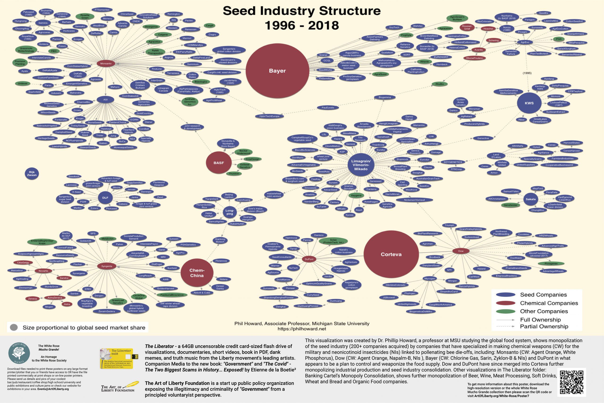 This visualization was created by Dr. Phillip Howard, a professor at MSU studying the global food system, shows the monopolization of the seed industry (200+ companies acquired) by companies that have specialized in making chemical weapons (CW) for the military and neonicotinoid insecticides (NIs) linked to pollenating bee die-offs, including: Monsanto (CW: Agent Orange, White Phosphorus), Dow (CW: Agent Orange, Napalm-B, NIs ), Bayer (CW: Chlorine Gas, Sarin, Zyklon-B & NIs) and DuPont in what appears to be a plan to control and weaponize the food supply. Dow and DuPont have since merged into Corteva further monopolizing industrial production and seed industry consolidation.