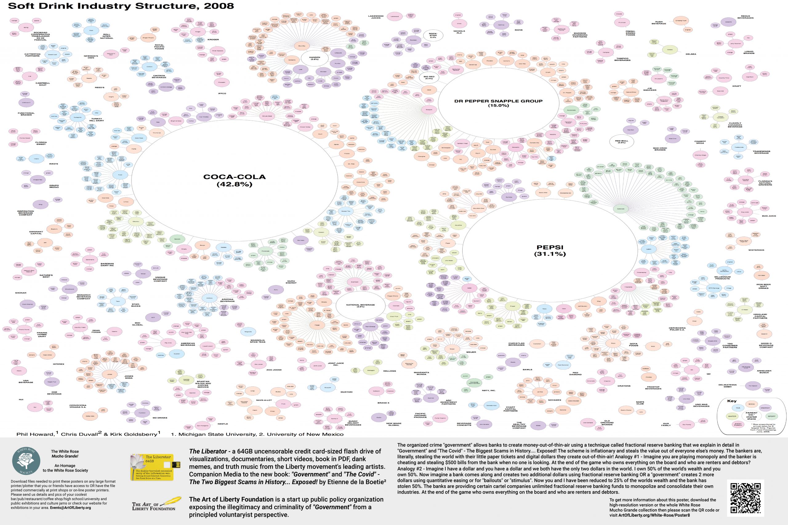 The White Rose – MUCHO GRANDE!  Instead of stickers, we have a free file of POSTERS featuring the full-size, high-res visualizations from “Government” – The Biggest Scam in History… Exposed!, a book revealing how inter-generational organized crime runs the “government,” media and academia, and a series of visualizations showing the monopolization of: media, consumer goods, defense contractors, beer, beverages, meat processing, airlines, community newspapers, and banks among others. The posters are designed to be exhibited in coffee shops, university commons, and other high-traffic locations, including liberty festivals, conferences and events in a decentralized manner by any activist that understands the power of visualization.