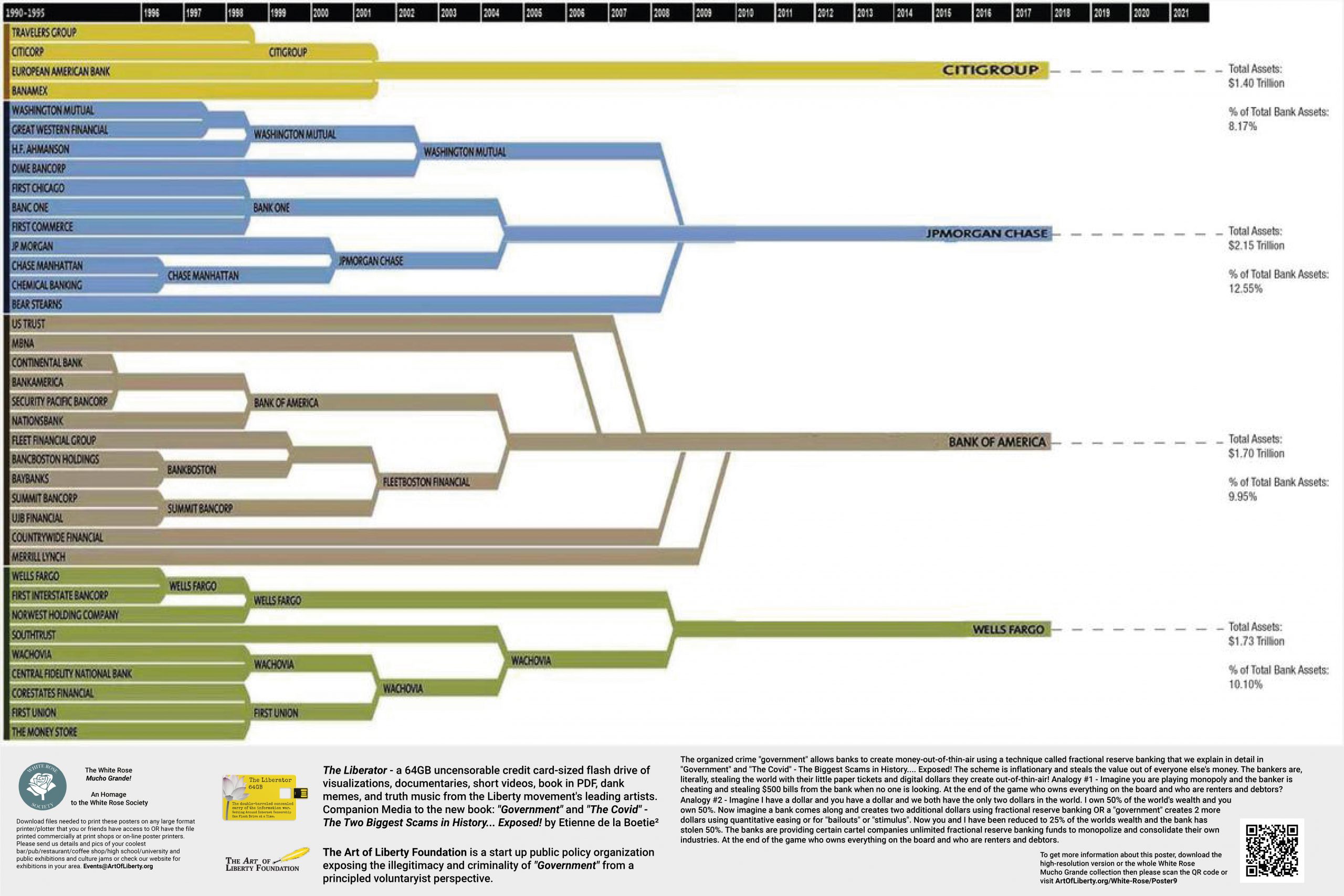 The White Rose – MUCHO GRANDE!  Instead of stickers, we have a free file of POSTERS featuring the full-size, high-res visualizations from “Government” – The Biggest Scam in History… Exposed!, a book revealing how inter-generational organized crime runs the “government,” media and academia, and a series of visualizations showing the monopolization of: media, consumer goods, defense contractors, beer, beverages, meat processing, airlines, community newspapers, and banks among others. The posters are designed to be exhibited in coffee shops, university commons, and other high-traffic locations, including liberty festivals, conferences and events in a decentralized manner by any activist that understands the power of visualization.